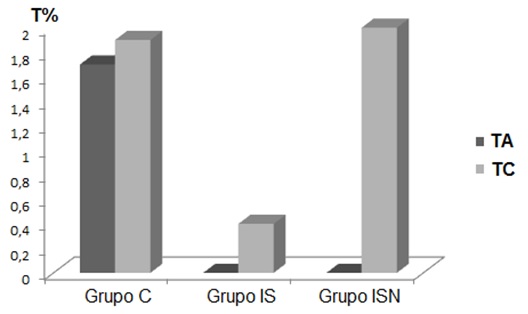 - Figura 4. Gráfico das porcentagens do tempo nos braços abertos (%TA) e do tempo no centro (%TC), dos diferentes grupos.
