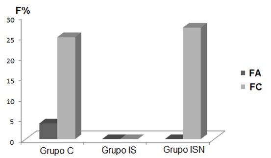 - Figura 5. Gráfico das porcentagens da frequência nos braços abertos (%FA) e da frequência no centro (%FC), dos diferentes grupos.
