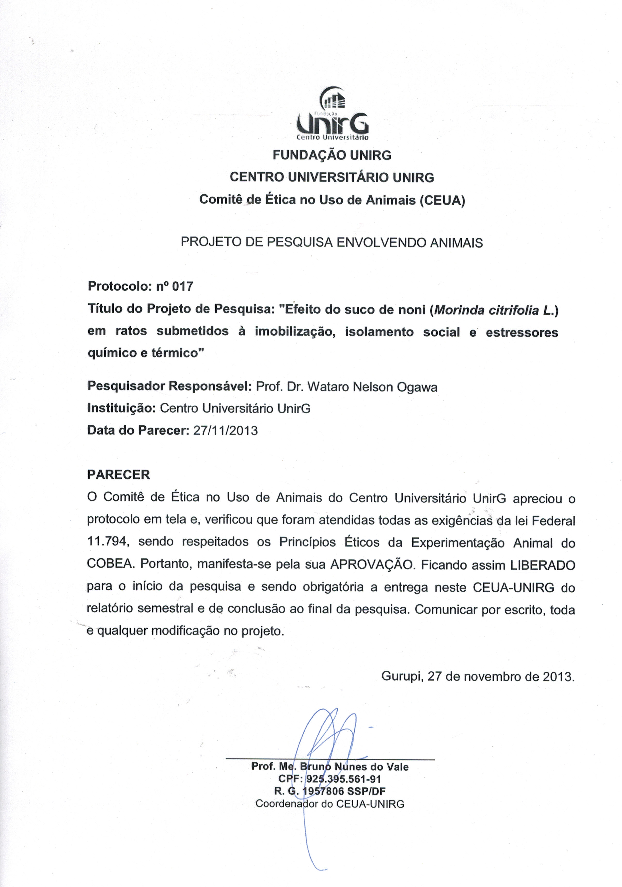 - Termo de aprovação do comitê de ética animal ( CEUA-UNIRG no 017)