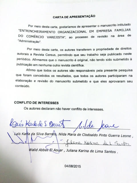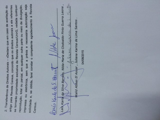 Os autores do manuscrito submetido declaram ter conhecimento que em caso de aceitação do artigo, a Revista Cereus, passa a ter todos os direitos autorais sobre o mesmo. O Artigo será de propriedade exclusiva da Revista, sendo vedada qualquer reprodução, em qualquer outra parte ou meio de divulgação, impressa ou eletrônica.