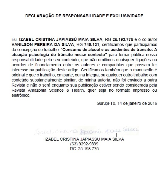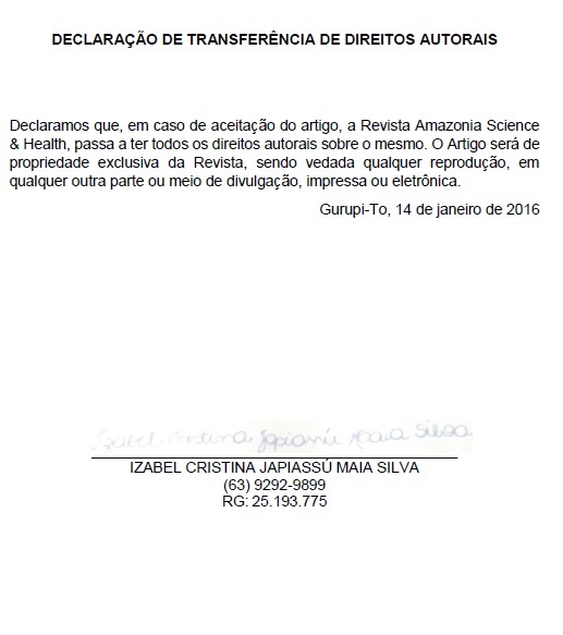 - 1º Os autores cedem à Revista Amazônia: Science & Health os direitos autorais no momento em que submetem seus artigos à mesma. Os autores declaram que o artigo submetido não foi publicado, e não está sendo considerado para publicação, na íntegra ou em parte em outro periódico. Os autores assumem total responsabilidade pela originalidade do artigo, podendo incidir sobre os mesmos, eventuais encargos decorrentes de reivindicação, por parte de terceiros, em relação à autoria do artigo.