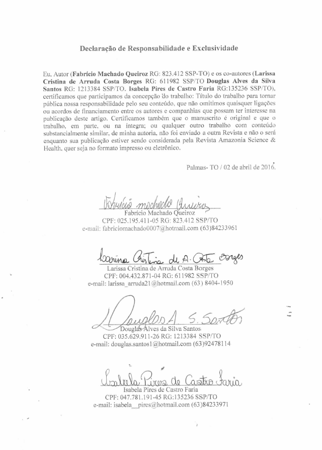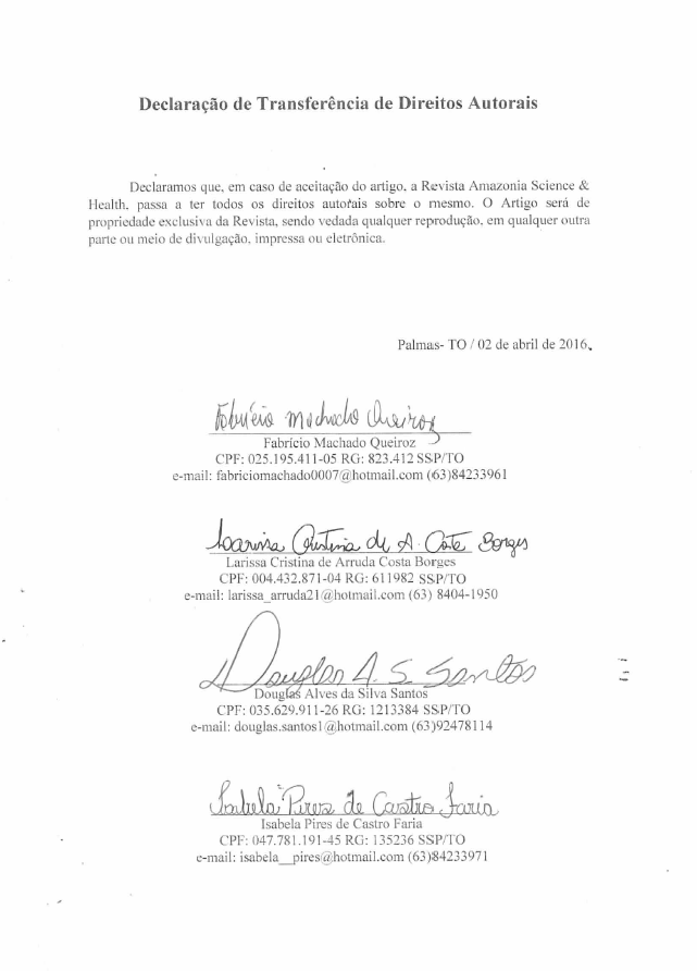 - 1º Os autores cedem à Revista Amazônia: Science & Health os direitos autorais no momento em que submetem seus artigos à mesma. Os autores declaram que o artigo submetido não foi publicado, e não está sendo considerado para publicação, na íntegra ou em parte em outro periódico. Os autores assumem total responsabilidade pela originalidade do artigo, podendo incidir sobre os mesmos, eventuais encargos decorrentes de reivindicação, por parte de terceiros, em relação à autoria do artigo.