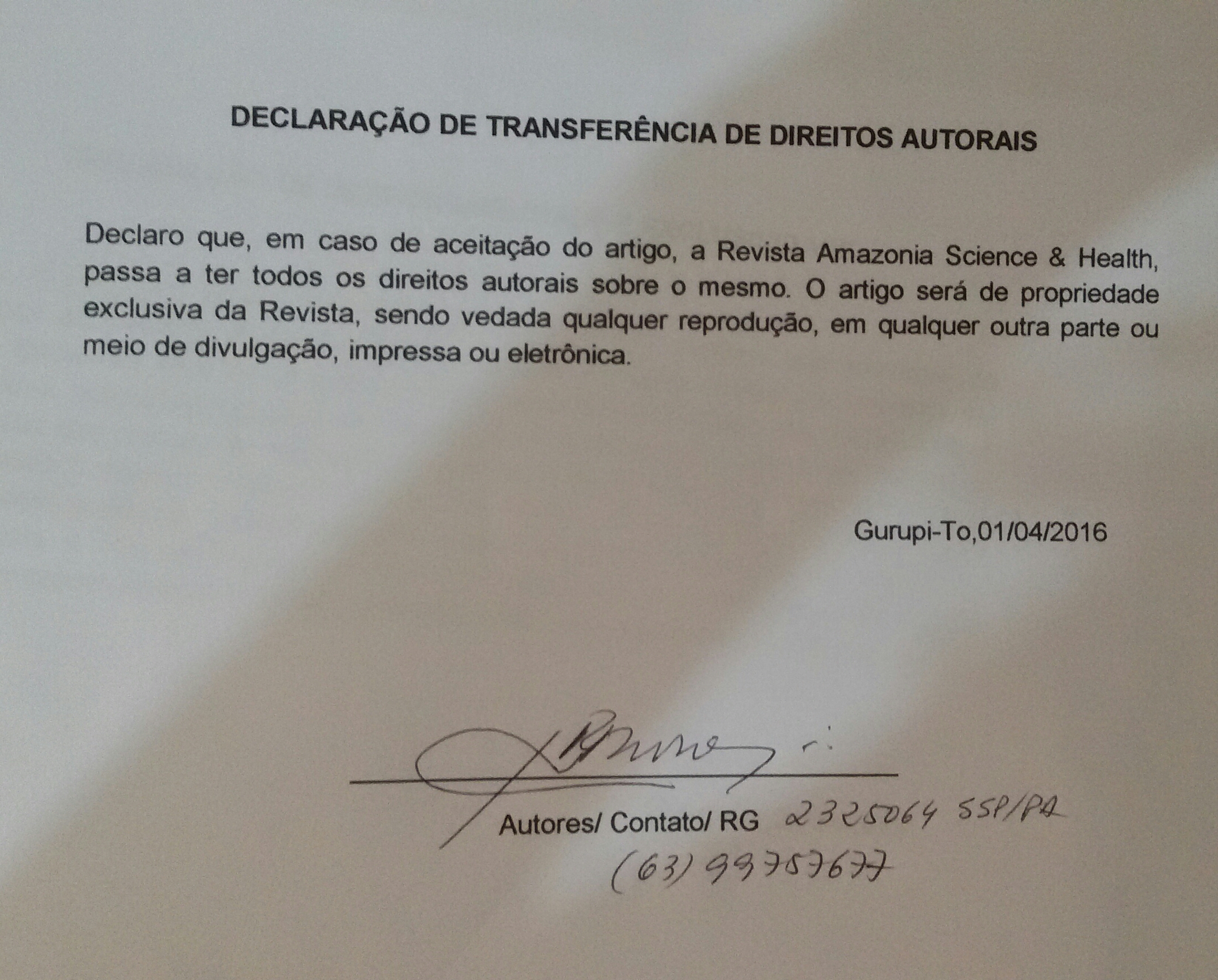 - 1º Os autores cedem à Revista Amazônia: Science & Health os direitos autorais no momento em que submetem seus artigos à mesma. Os autores declaram que o artigo submetido não foi publicado, e não está sendo considerado para publicação, na íntegra ou em parte em outro periódico. Os autores assumem total responsabilidade pela originalidade do artigo, podendo incidir sobre os mesmos, eventuais encargos decorrentes de reivindicação, por parte de terceiros, em relação à autoria do artigo.