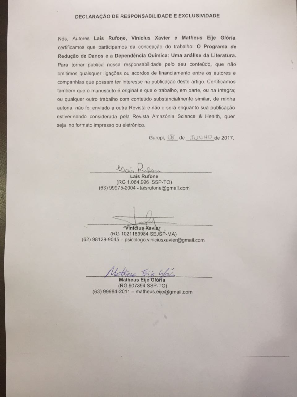 - 1º Os autores cedem à Revista Amazônia: Science & Health os direitos autorais no momento em que submetem seus artigos à mesma. Os autores declaram que o artigo submetido não foi publicado, e não está sendo considerado para publicação, na íntegra ou em parte em outro periódico. Os autores assumem total responsabilidade pela originalidade do artigo, podendo incidir sobre os mesmos, eventuais encargos decorrentes de reivindicação, por parte de terceiros, em relação à autoria do artigo.