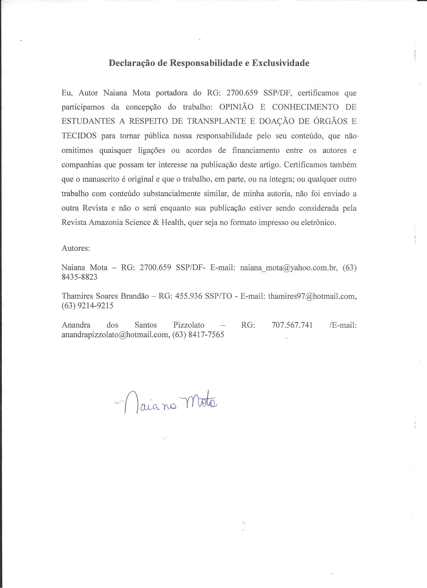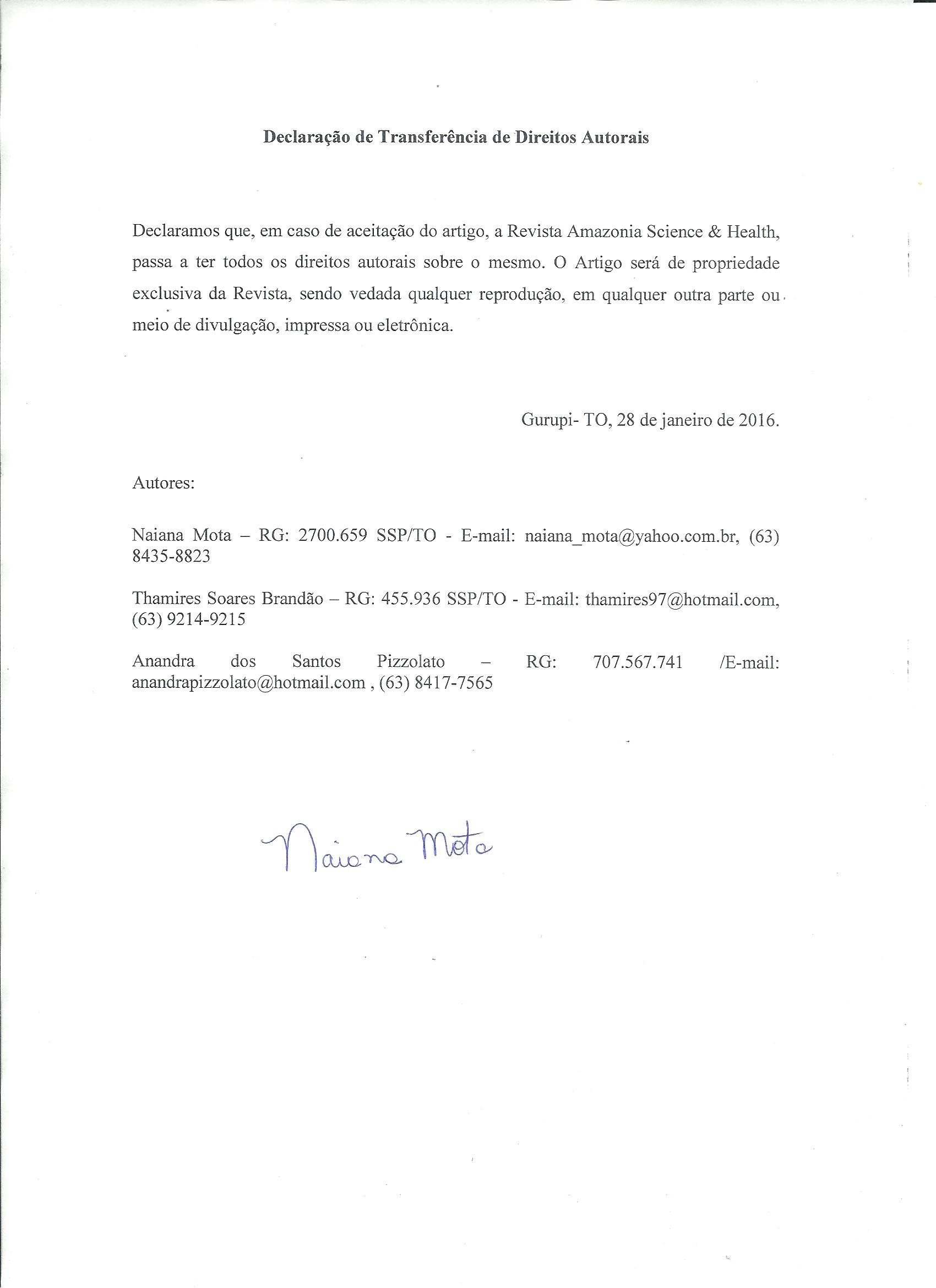 - 1º Os autores cedem à Revista Amazônia: Science & Health os direitos autorais no momento em que submetem seus artigos à mesma. Os autores declaram que o artigo submetido não foi publicado, e não está sendo considerado para publicação, na íntegra ou em parte em outro periódico. Os autores assumem total responsabilidade pela originalidade do artigo, podendo incidir sobre os mesmos, eventuais encargos decorrentes de reivindicação, por parte de terceiros, em relação à autoria do artigo.