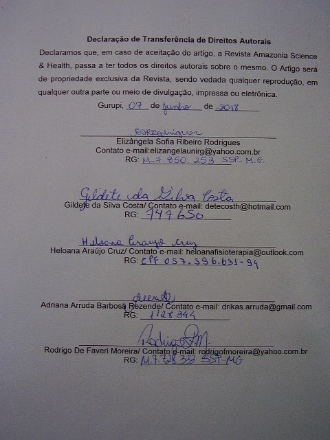 - 1º Os autores cedem à Revista Amazônia: Science & Health os direitos autorais no momento em que submetem seus artigos à mesma. Os autores declaram que o artigo submetido não foi publicado, e não está sendo considerado para publicação, na íntegra ou em parte em outro periódico. Os autores assumem total responsabilidade pela originalidade do artigo, podendo incidir sobre os mesmos, eventuais encargos decorrentes de reivindicação, por parte de terceiros, em relação à autoria do artigo.