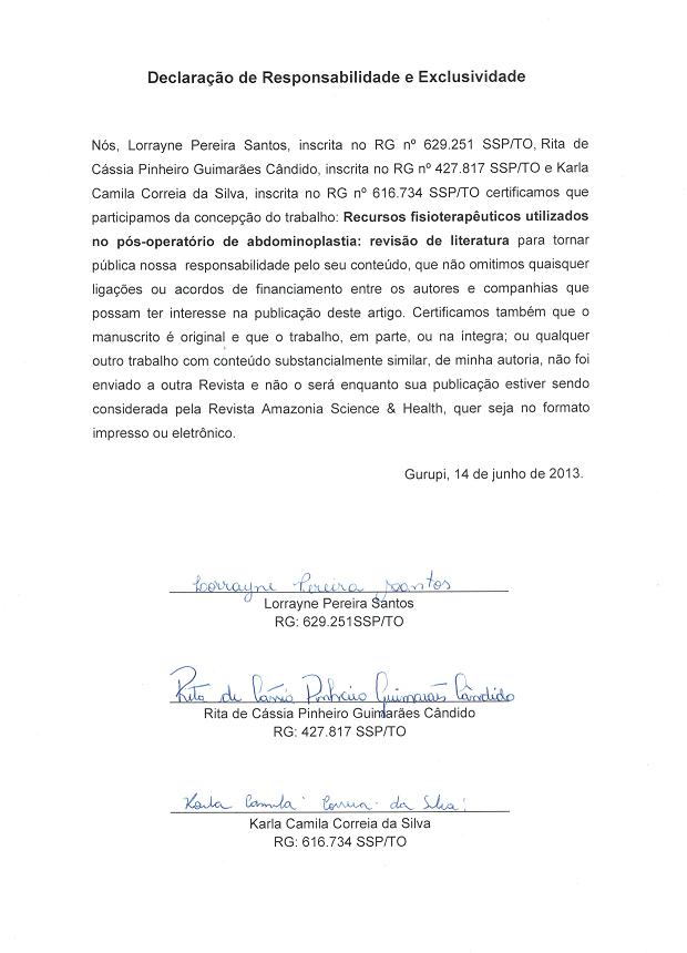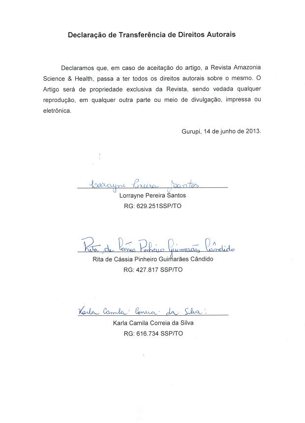- 1º Os autores cedem à Revista Amazônia: Science & Health os direitos autorais no momento em que submetem seus artigos à mesma. Os autores declaram que o artigo submetido não foi publicado, e não está sendo considerado para publicação, na íntegra ou em parte em outro periódico. Os autores assumem total responsabilidade pela originalidade do artigo, podendo incidir sobre os mesmos, eventuais encargos decorrentes de reivindicação, por parte de terceiros, em relação à autoria do artigo.