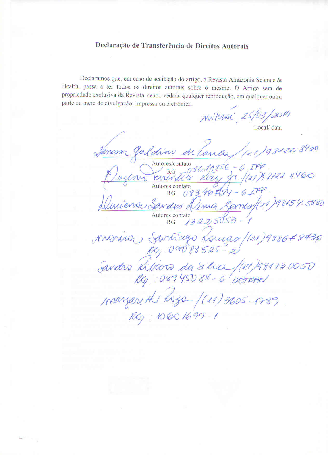 - 1º Os autores cedem à Revista Amazônia: Science & Health os direitos autorais no momento em que submetem seus artigos à mesma. Os autores declaram que o artigo submetido não foi publicado, e não está sendo considerado para publicação, na íntegra ou em parte em outro periódico. Os autores assumem total responsabilidade pela originalidade do artigo, podendo incidir sobre os mesmos, eventuais encargos decorrentes de reivindicação, por parte de terceiros, em relação à autoria do artigo.