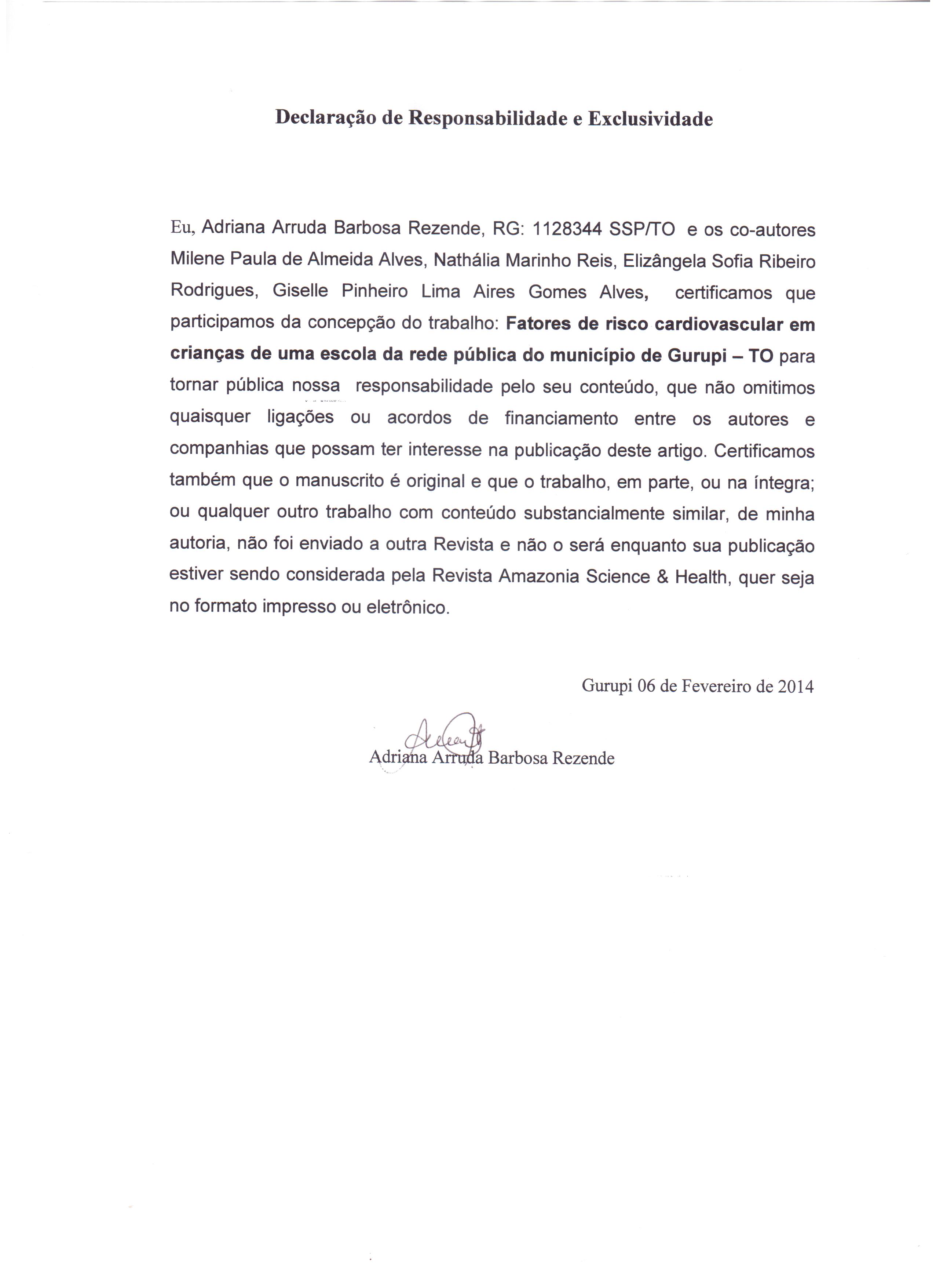 - 1º Os autores cedem à Revista Amazônia: Science & Health os direitos autorais no momento em que submetem seus artigos à mesma. Os autores declaram que o artigo submetido não foi publicado, e não está sendo considerado para publicação, na íntegra ou em parte em outro periódico. Os autores assumem total responsabilidade pela originalidade do artigo, podendo incidir sobre os mesmos, eventuais encargos decorrentes de reivindicação, por parte de terceiros, em relação à autoria do artigo.