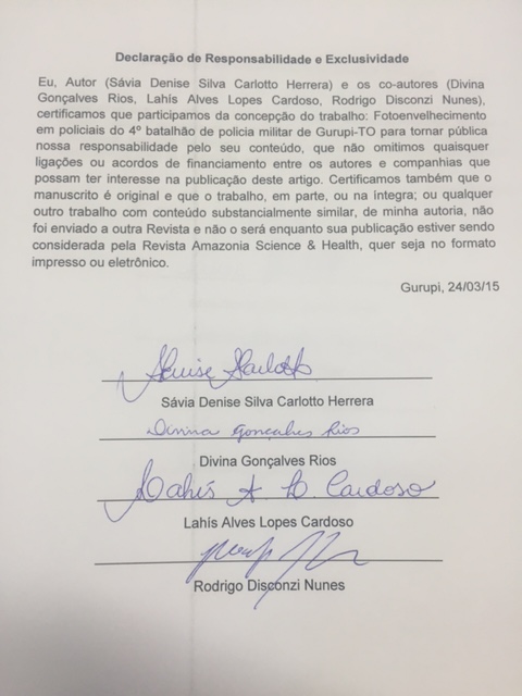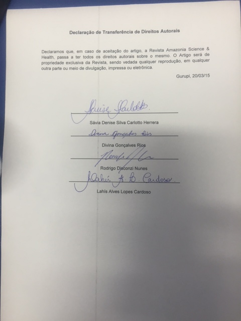 - 1º Os autores cedem à Revista Amazônia: Science & Health os direitos autorais no momento em que submetem seus artigos à mesma. Os autores declaram que o artigo submetido não foi publicado, e não está sendo considerado para publicação, na íntegra ou em parte em outro periódico. Os autores assumem total responsabilidade pela originalidade do artigo, podendo incidir sobre os mesmos, eventuais encargos decorrentes de reivindicação, por parte de terceiros, em relação à autoria do artigo.