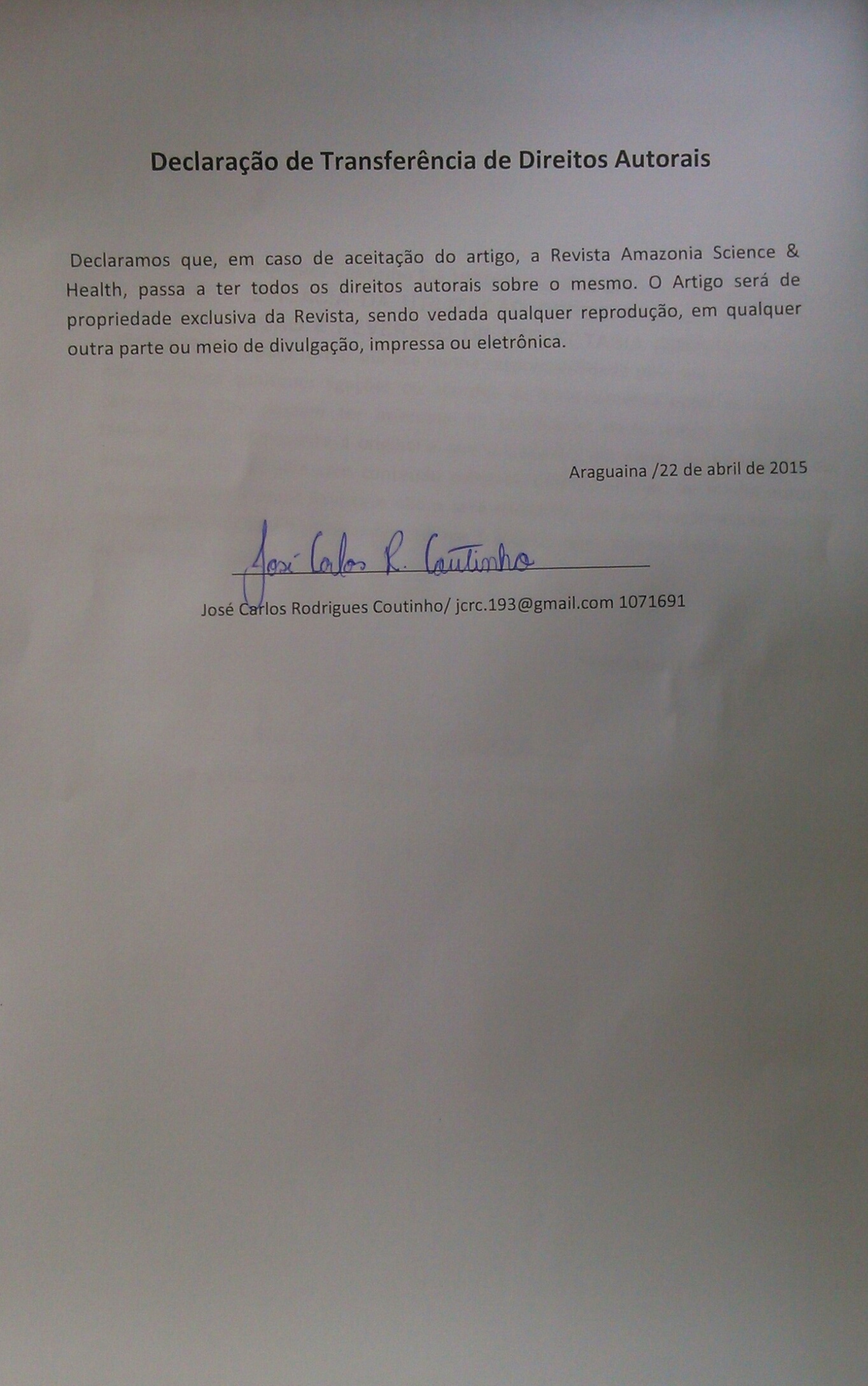 - 1º Os autores cedem à Revista Amazônia: Science & Health os direitos autorais no momento em que submetem seus artigos à mesma. Os autores declaram que o artigo submetido não foi publicado, e não está sendo considerado para publicação, na íntegra ou em parte em outro periódico. Os autores assumem total responsabilidade pela originalidade do artigo, podendo incidir sobre os mesmos, eventuais encargos decorrentes de reivindicação, por parte de terceiros, em relação à autoria do artigo.
