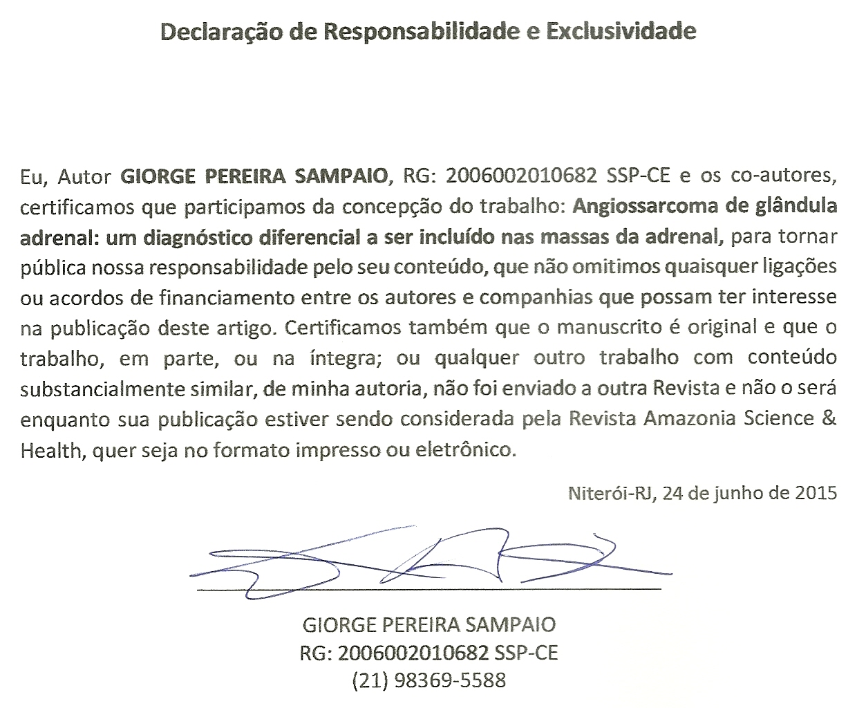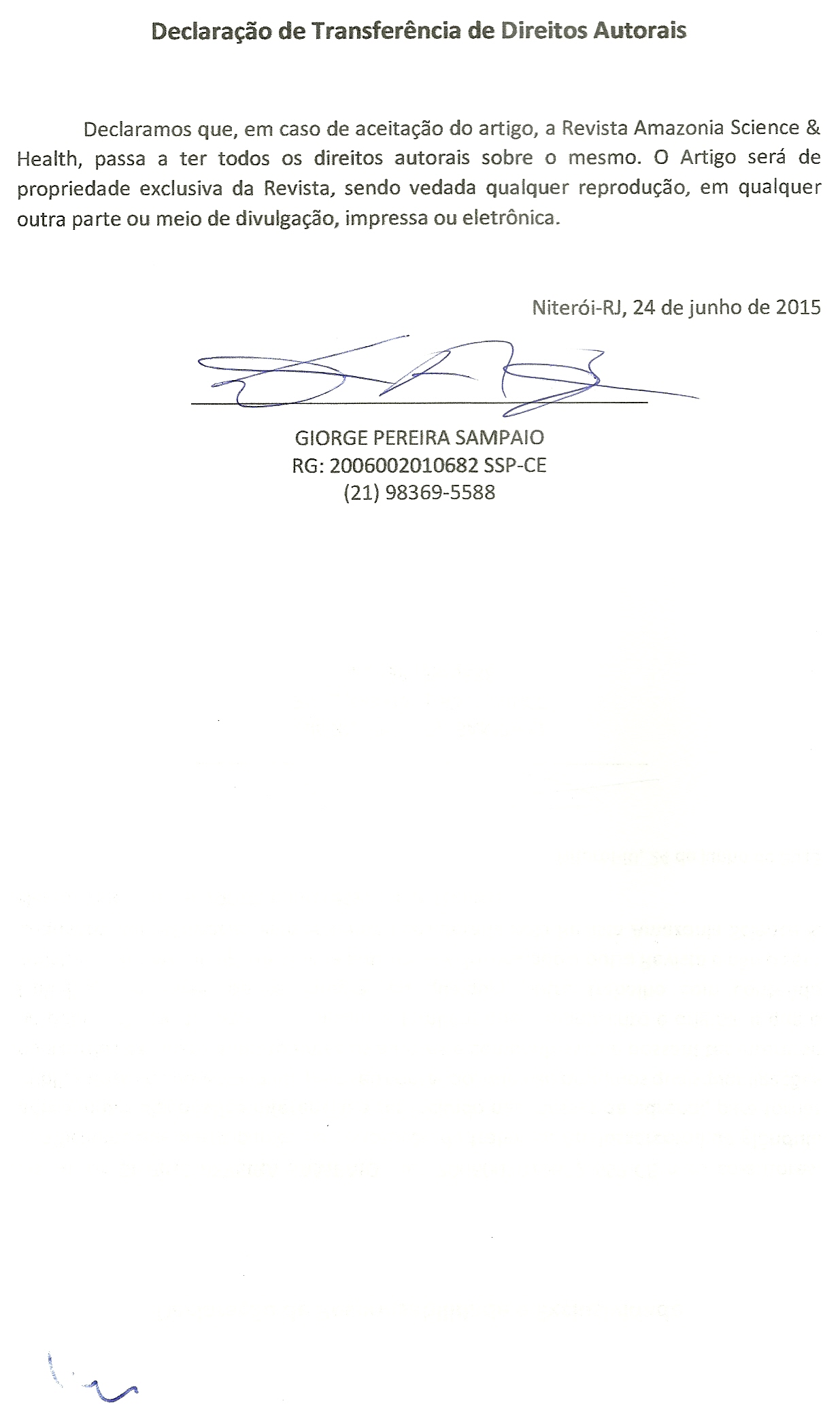 - 1º Os autores cedem à Revista Amazônia: Science & Health os direitos autorais no momento em que submetem seus artigos à mesma. Os autores declaram que o artigo submetido não foi publicado, e não está sendo considerado para publicação, na íntegra ou em parte em outro periódico. Os autores assumem total responsabilidade pela originalidade do artigo, podendo incidir sobre os mesmos, eventuais encargos decorrentes de reivindicação, por parte de terceiros, em relação à autoria do artigo.
