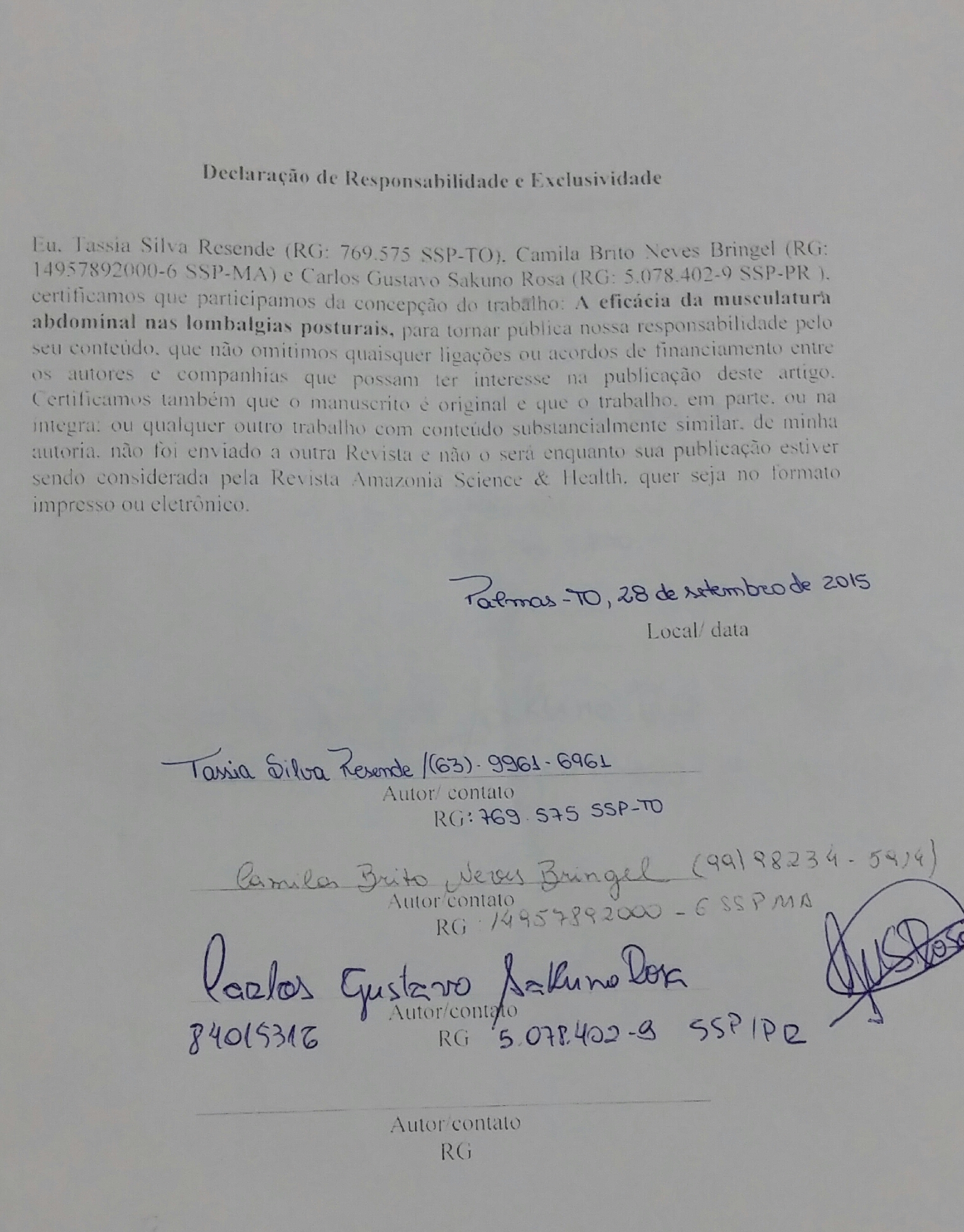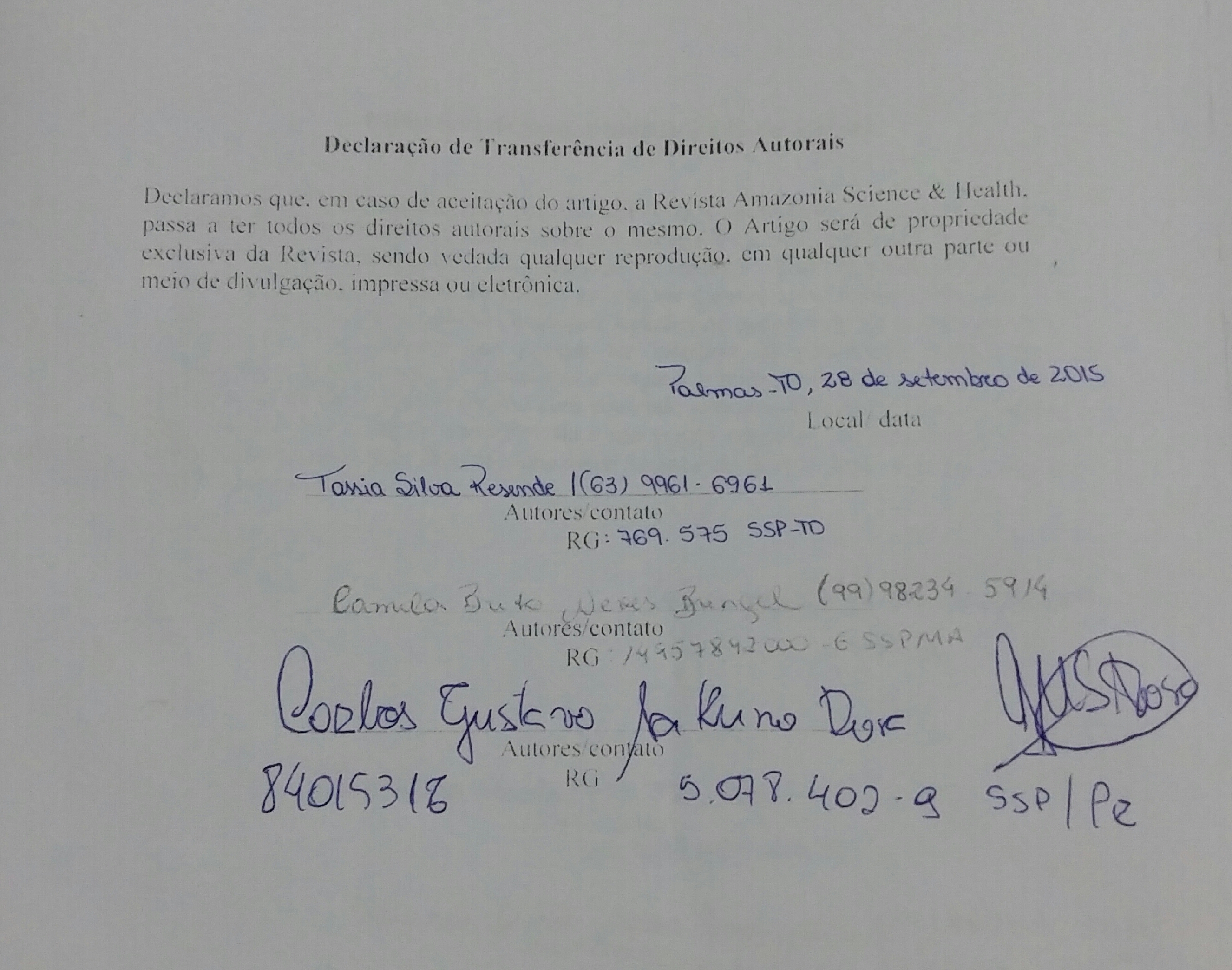 - 1º Os autores cedem à Revista Amazônia: Science & Health os direitos autorais no momento em que submetem seus artigos à mesma. Os autores declaram que o artigo submetido não foi publicado, e não está sendo considerado para publicação, na íntegra ou em parte em outro periódico. Os autores assumem total responsabilidade pela originalidade do artigo, podendo incidir sobre os mesmos, eventuais encargos decorrentes de reivindicação, por parte de terceiros, em relação à autoria do artigo.